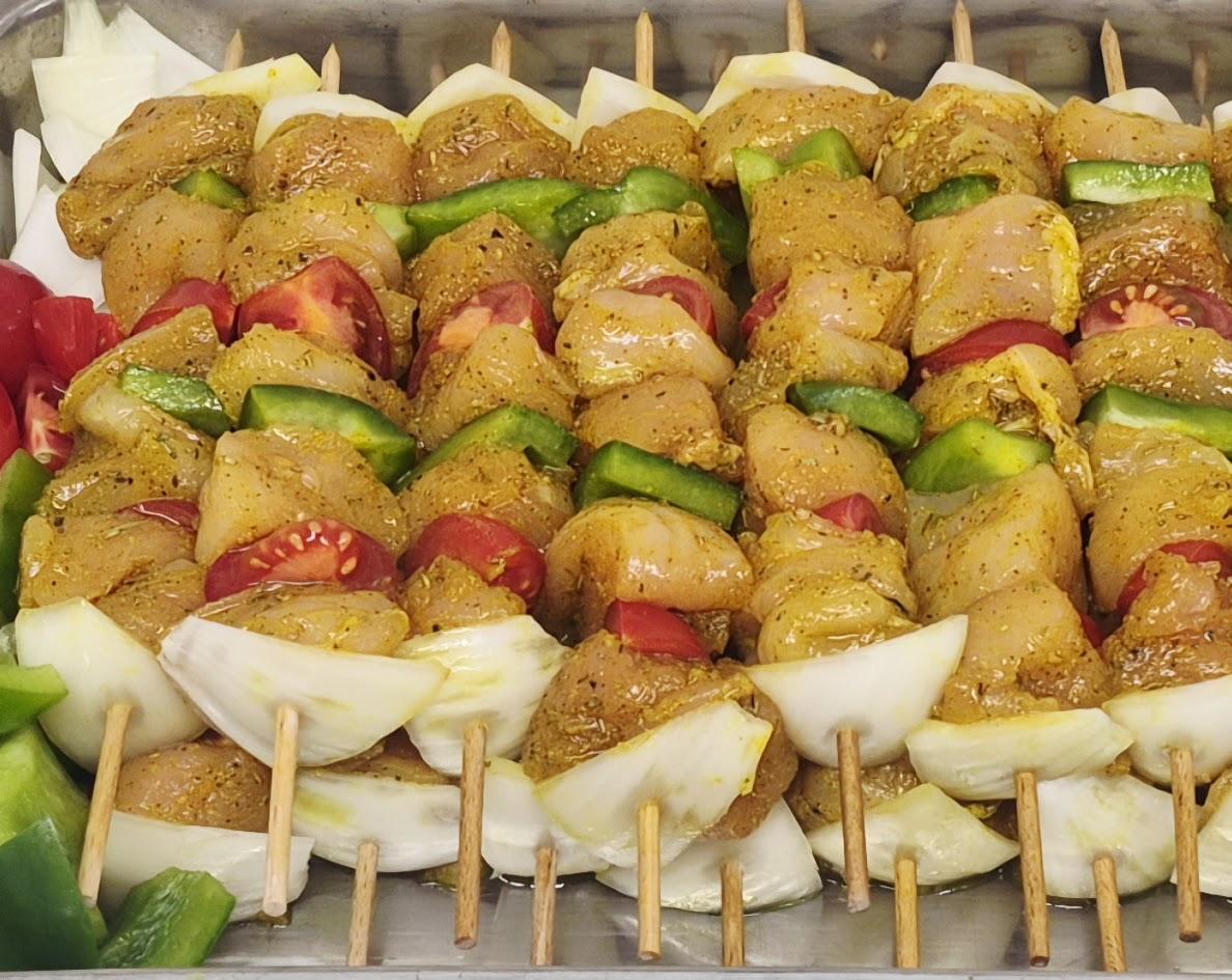 Borchette de Viande de volaille marinée et légumes, idéal pour les barbecues.
