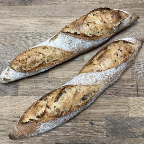 Pain à base de farine de froment. Tournesol et lin brun à l'intérieur et pavot à l'extérieur.