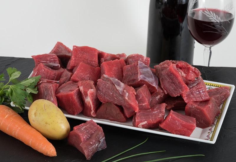 Nous vous proposons ici des colis de1kg de pièces de viande de race Blonde d'Aquitain.Ce Bourguignon est coupés en cubes, prêt à mijoter...