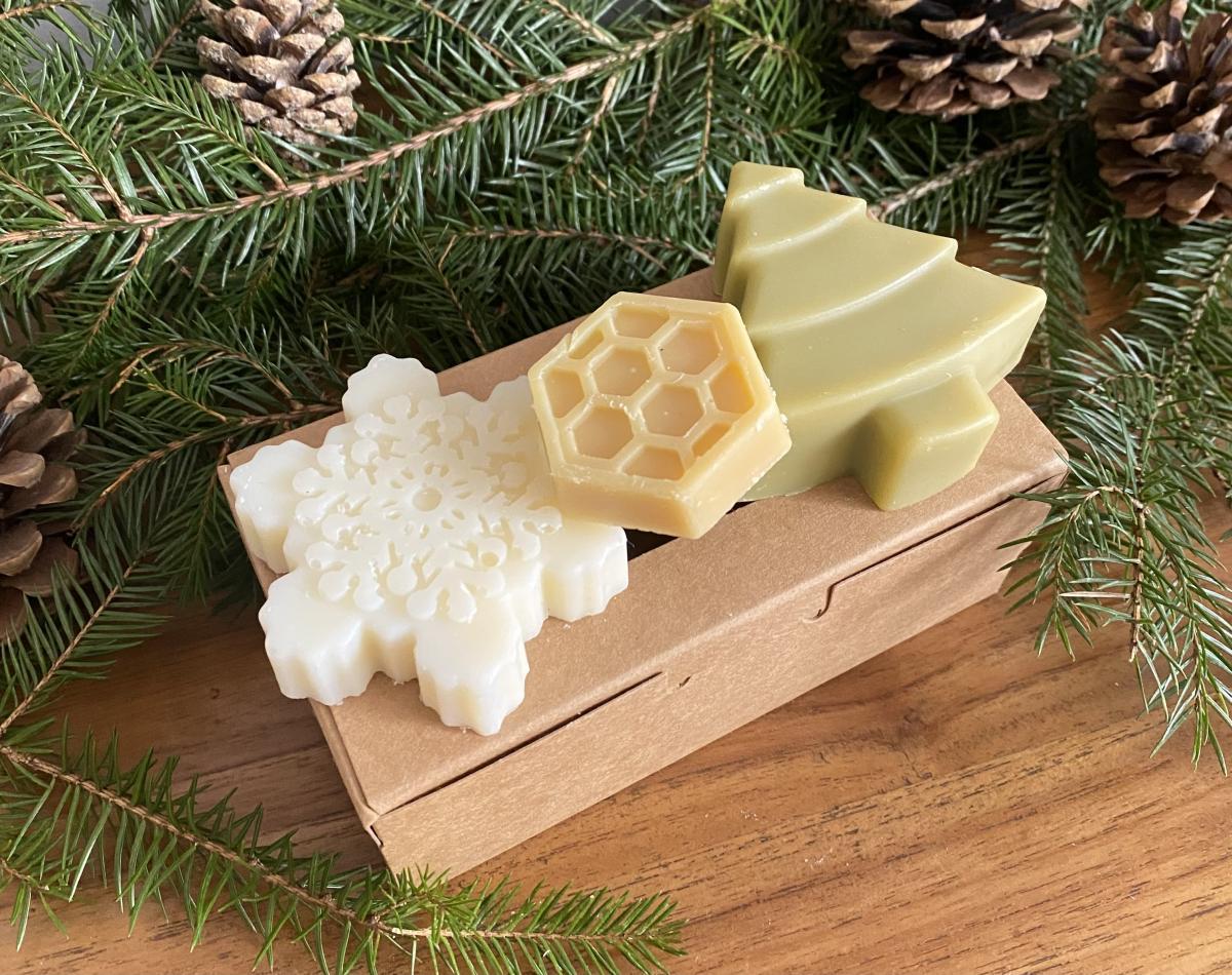 Coffret hiver vosgien composé de 3 savons : un savon coco et olive (flocon), un savon à la spiruline (sapin), un mini savon lait d'avoine et miel