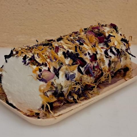 Ingrédients : lait cru entier de vache, ferments lactiques, sel, présure, enrobage : fleurs de mauve, fleurs de bleuet, souci, fleurs de carthame, feuilles de fraises, fleur de roses, trigonnelle bleue.
