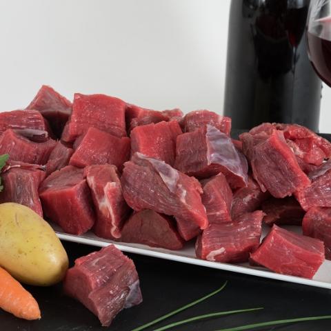 Nous vous proposons ici des colis de1kg de pièces de viande de race Blonde d'Aquitain.Ce Bourguignon est coupés en cubes, prêt à mijoter...