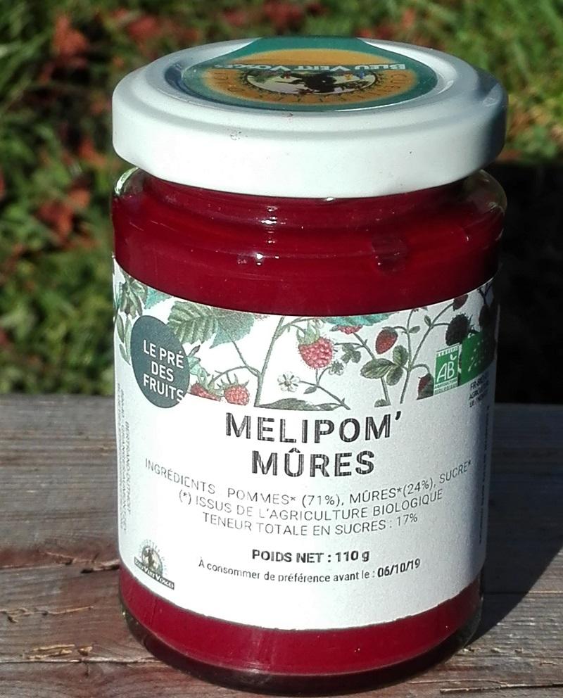 Compote Bio composée d'un mélange 3/4 pomme 1/4 de mûres et avec seulement 8 % de sucre ajouté, en petit pot de 110 g