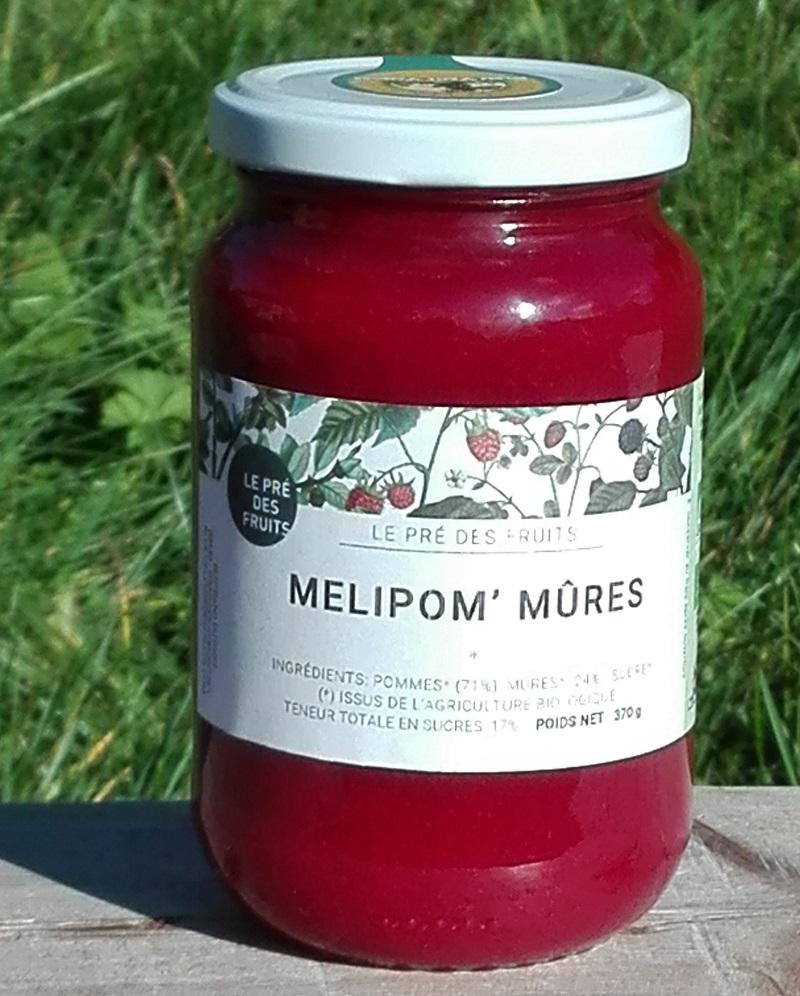 Compote Bio composée d'un mélange 3/4 pomme 1/4 de mûres et avec seulement 8 % de sucre ajouté, en pot de 370 g