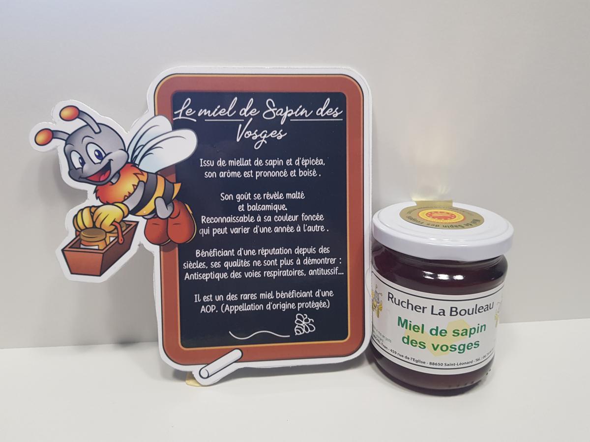 Issu de miellat de sapin son arôme est prononcé et boisé. Reconnaissable à sa couleur foncée qui peut varier d'une année à l'autre.