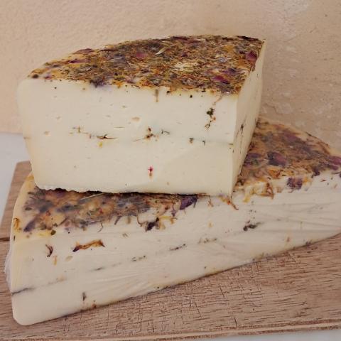 Fromage frais au lait cru arômatisé aux herbes .Ingrédients : Lait cru entier ferments, sel, épices ( poivron, moutarde, origan, thym).