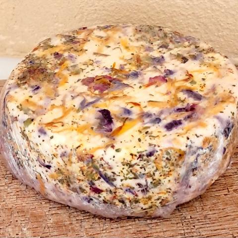 Ingrédients : lait cru entier de vache, ferments lactiques, sel, présure, enrobage : fleurs de mauve, fleurs de bleuet, souci, fleurs de carthame, feuilles de fraises, fleur de roses, trigonnelle bleue.