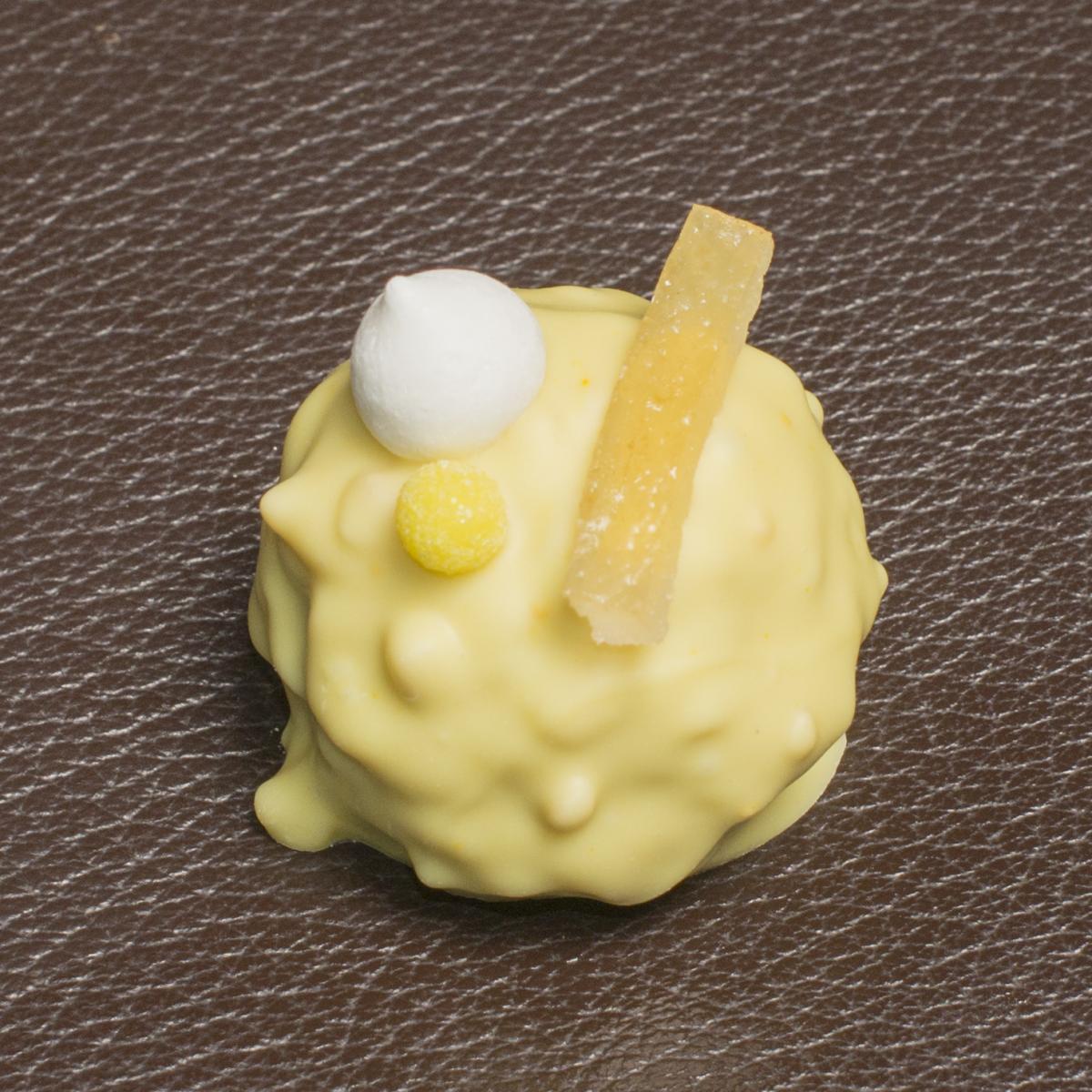 Citron confit, meringue : blanc d’ŒUF, sucre, alcool, jus de citron, lécithine de tournesol, colorant E102, arôme.