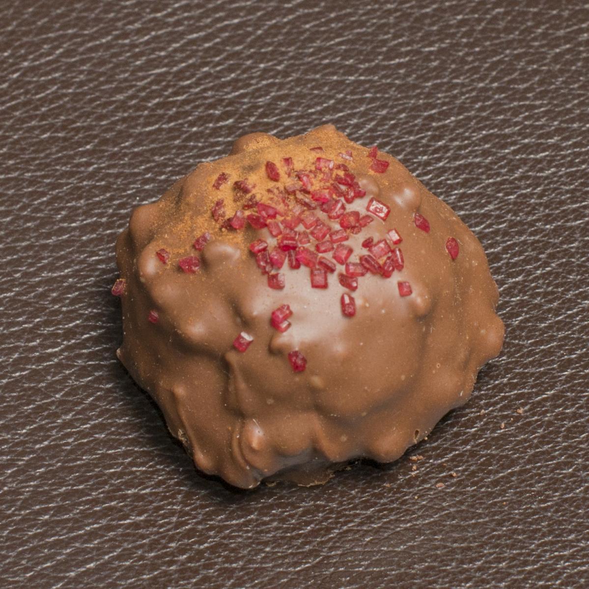 Composition: Beurre de cacao 38% minimum LAIT entier en poudre, poudre de LAIT écrémé, matière grasse de LAIT, sucre, beurre de cacao, émulsifiant : lécithine de tournesol, Praliné : AMANDES, NOISETTES, huile d’AMANDE raffinée, lécithine de SOJA, arôme vanille