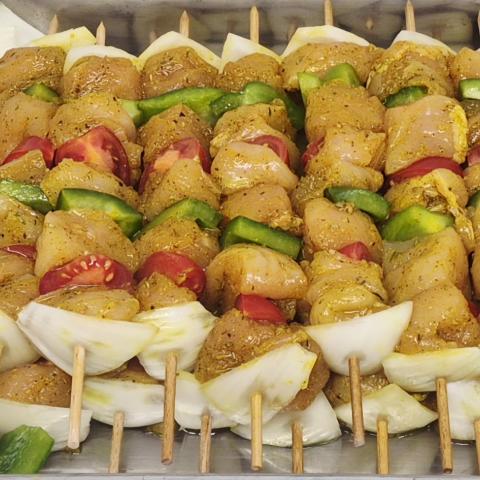 Brochette de Viande de volaille marinée et légumes, idéal pour les barbecues.